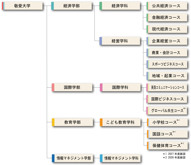 | 2016(平成28)年 | 創立50周年 経済学科、経営学科のコース名称を変更 国際学科のコースを専攻に変更 |
